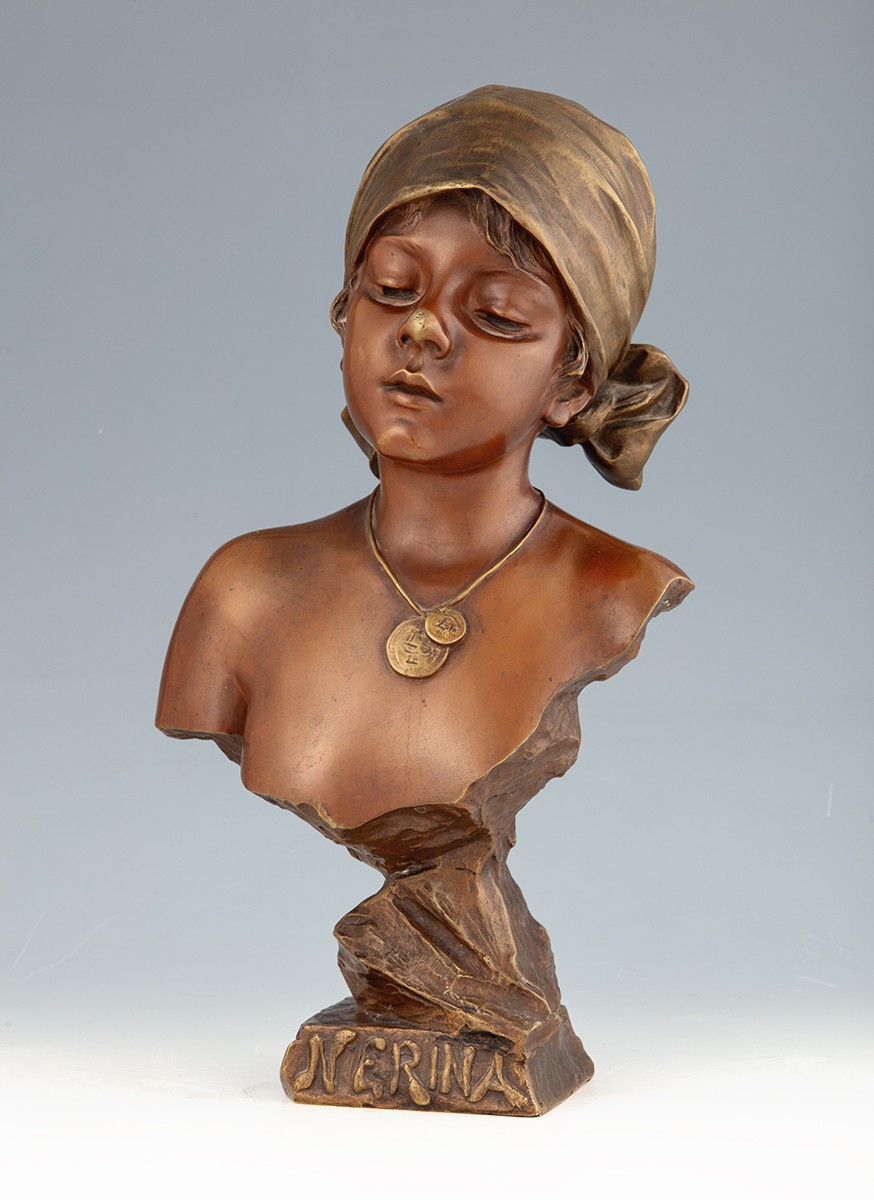 Öntött, patinázott bronz. Talapzatán ‘Nerina’ felirat, hátoldalán H. Hirschwald berlini öntőműhely pecsétjével. Emmanuel Villanis