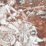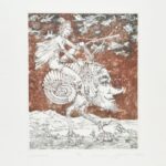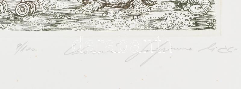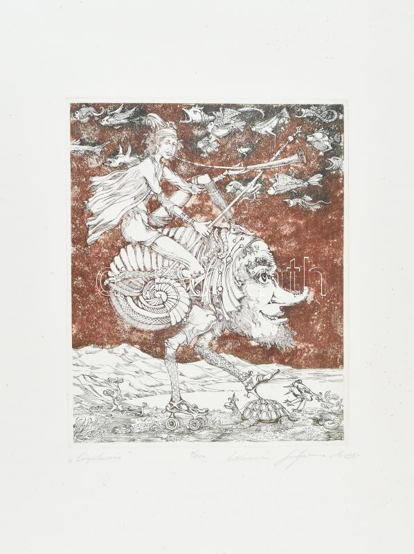 Kolozsvári Grandpierre Miklós (1950- ): Csigalovász. Színes rézkarc, papír. Jelzett, számozott (9/100), lap szélén apró foltokkal, 30×24 cm<a href="https://www.darabanth.com/hu/gyorsarveres/414/kategoriak~Festmenyek-es-grafikak/Festmenyek-es-grafika