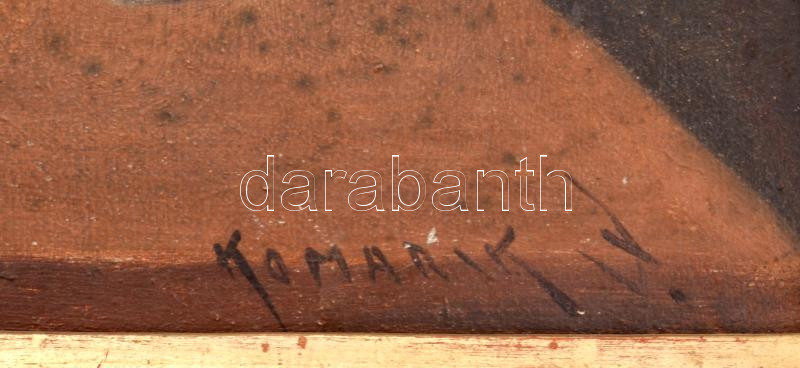 Komárik János, működött a XX. sz. első felében: Hírek. Olaj, vászon. Jelzett. Sérült, javított. Dekoratív, kissé sérült fakeretben, hátoldalán Géberth képkeretező címkéjével. 31×55 cm<a href="https://www.darabanth.com/hu/gyorsarveres/430/kategoriak~
