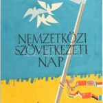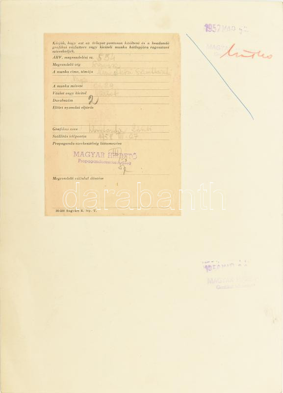 Konstantin László (1930- ): Nemzetközi Szövetkezeti Nap, június 6. Plakátterv, 1957 körül. Vegyes technika, papír. Jelzés nélkül, hátoldalán az ÁHV űrlapjával, ill. a Magyar Hirdető bélyegzőivel. Kis felületi sérülésekkel, 29×20,5 cm<a href="https:/