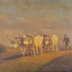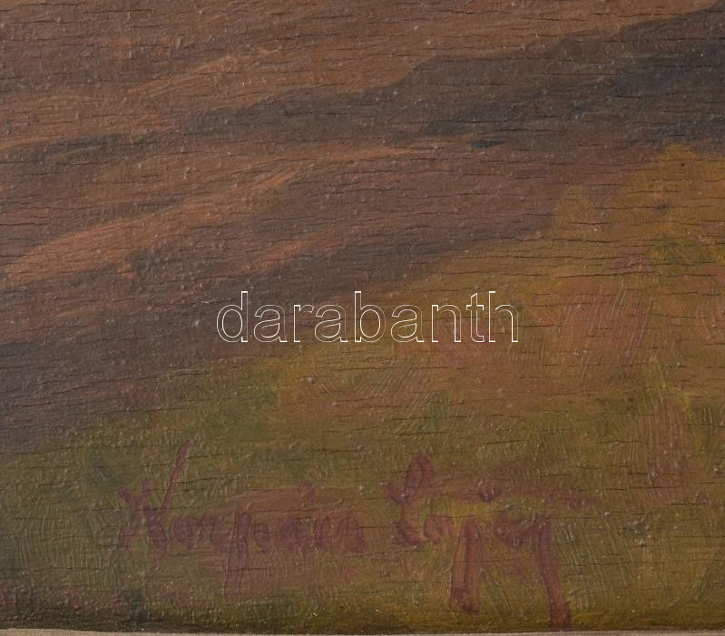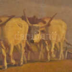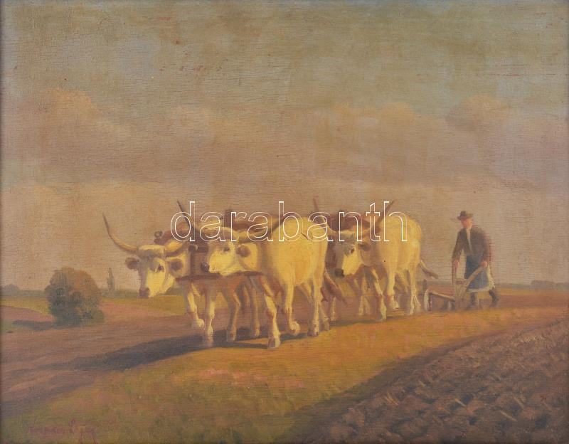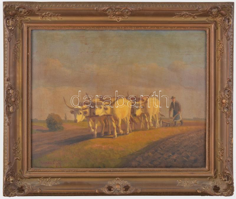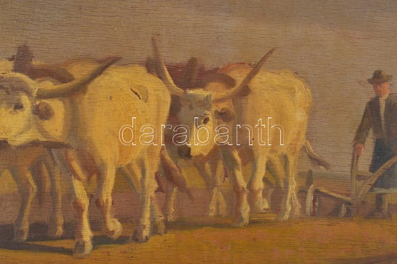Korpács Lajos (19-20. század): Szántás szürke szarvasmarhákkal. Olaj, falemez. Jelezve balra lent: Korpács Lajos. 40×50 cm Korabeli blondel keretben.<a href="https://www.darabanth.com/hu/gyorsarveres/436/kategoriak~Festmenyek-es-grafikak/Festmenyek-