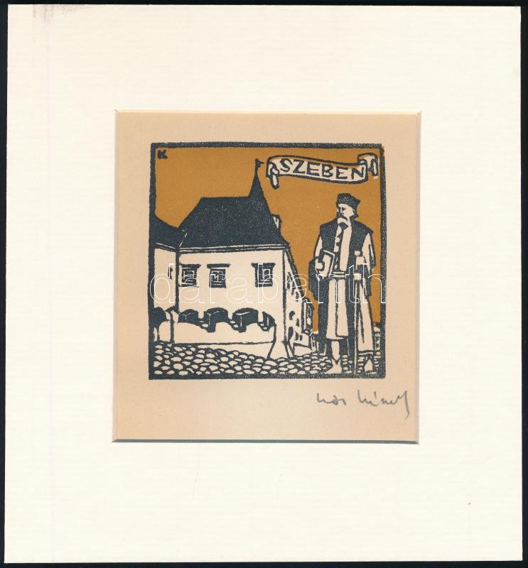 Kós Károly (1883-1977): Szeben. Linómetszet, papír, utólagos jelzéssel, paszpartuban, 11×11 cm