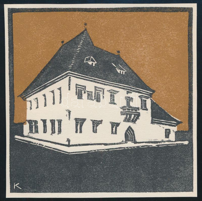 Kós Károly (1883-1977): Udvarház. Linómetszet, papír, jelzett a dúcon, körbevágott, 11×11 cm<a href="https://www.darabanth.com/hu/gyorsarveres/432/kategoriak~Festmenyek-es-grafikak/Festmenyek-es-grafikak~500023/Kos-Karoly-1883-1977-Udvarhaz-Linomets