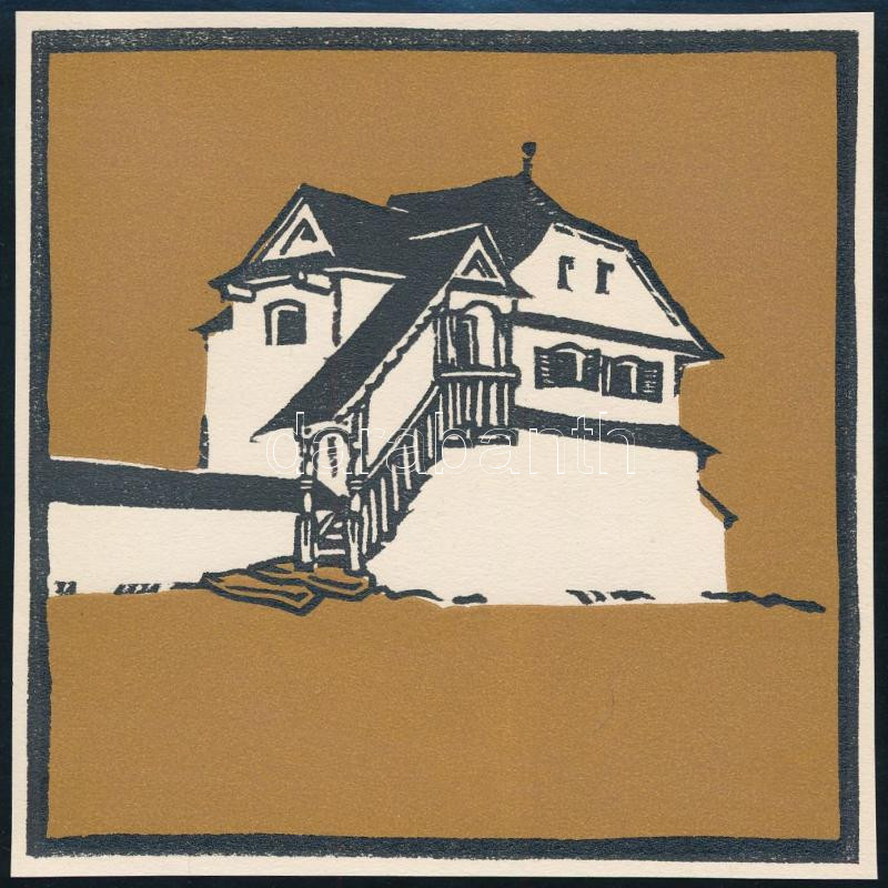 Kós Károly (1883-1977): Udvarház. Linómetszet, papír, jelzett a dúcon, körbevágott, kopott, 11×11 cm<a href="https://www.darabanth.com/hu/gyorsarveres/435/kategoriak~Festmenyek-es-grafikak/Festmenyek-es-grafikak~500001/Kos-Karoly-1883-1977-Udvarhaz-