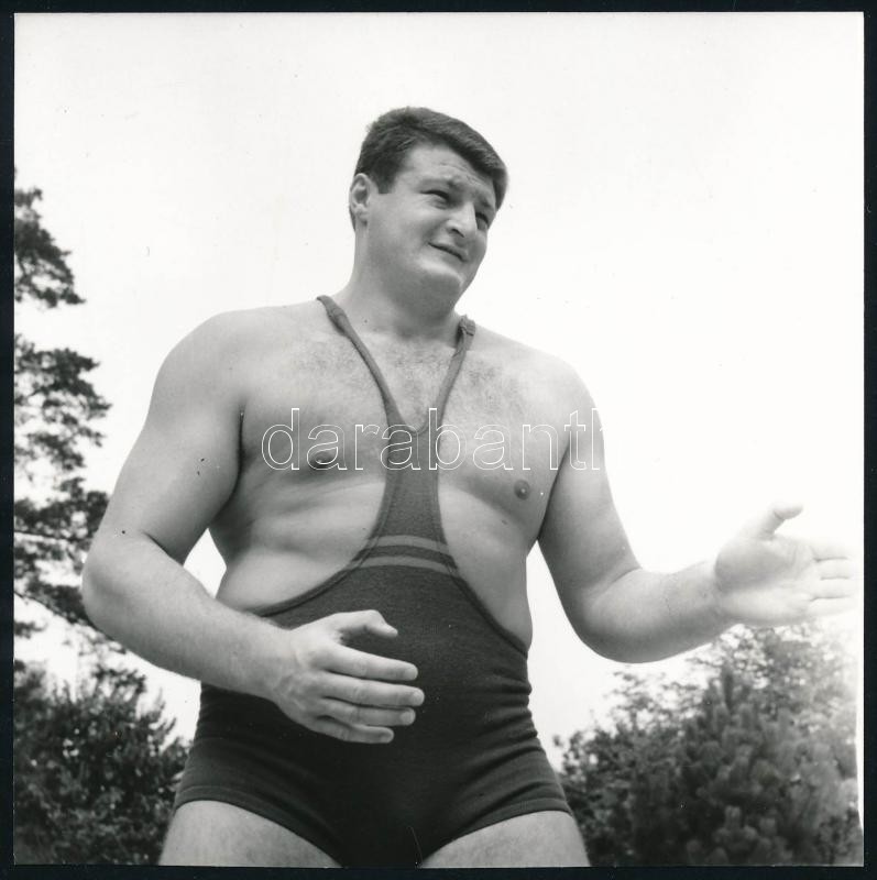 Kozma István ‘Pici’ olimpiai bajnok birkózó, hátoldalon feliratozott sajtófotó, utólagos előhívás, 18×13 cm