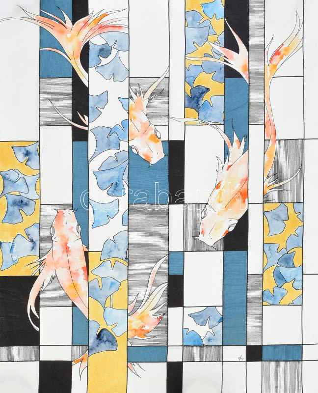 Kun Sarolta (1990-): Zodiákus sorozat: Halak. Vegyes technika, papír, jelzett, felcsavarva, 40×50 cm<a href="https://www.darabanth.com/hu/gyorsarveres/437/kategoriak~Festmenyek-es-grafikak/Festmenyek-es-grafikak~500001/Kun-Sarolta-1990-Zodiakus-soro