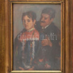Kunffy Lajos (1869-1962): Szerelmespár. Olaj, fa, jelezve jobbra lent. Dekoratív, üvegezett, sérült fakeretben. 35×25 cm. Hátoldalán régi aukciós címkével (BÁV?). / oil on wood, signed. framed, with old auction label on the reverse