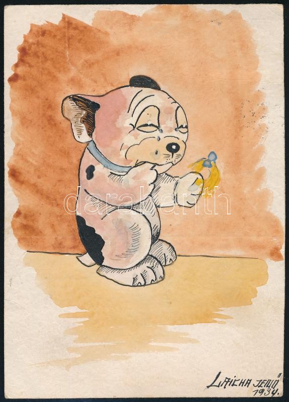 Laicha Jenő (?-? ): Kutyus, 1934. Vegyes technika, papír. Jelzett. 15X10,5cm<a href="https://www.darabanth.com/hu/gyorsarveres/417/kategoriak~Festmenyek-es-grafikak/Festmenyek-es-grafikak~1/Laicha-Jeno-Kutyus-1934-Vegyes-technika-papir-Jelzett-15X10