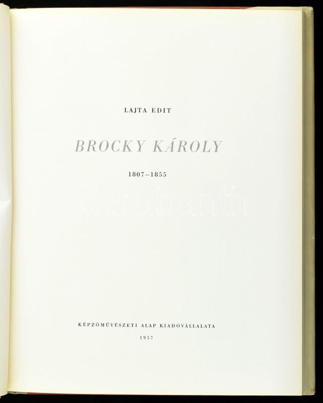 Lajta Edit: Brocky Károly. 1807-1855. Magyar Mesterek sorozat. Bp., 1957., Képzőművészeti Alap. A művész munkáinak fekete-fehér reprodukcióival. Kiadói félvászon-kötés, kiadói kissé kopott papír védőborítóban.<a href="https://www.darabanth.com/hu/gy