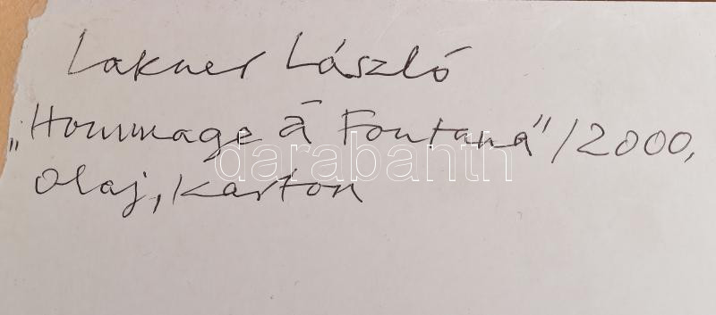 Lakner László (1936-): ‘Hommage á Fontana’, 2000. Olaj, karton. Jelezve balra lent: Lakner 2000. Hátoldalán autográf felirattal. Üvegezett fakeretben. 70×48,5 cm / László Lakner (1936-): ‘Hommage á Fontana’, 2000. Oil on board. Signed lower left: Lakner 2
