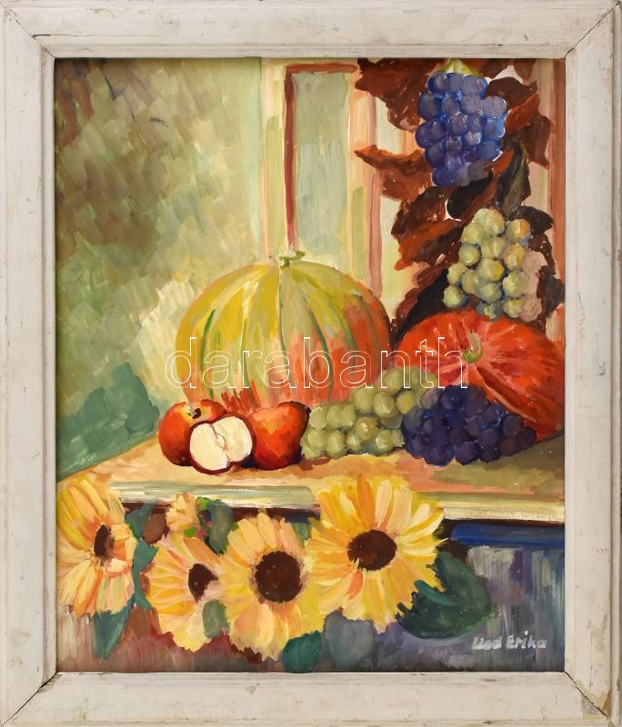Lied (?) Erika jelzéssel: Csendélet. Olaj, karton. Kissé sérült fakeretben. 34,5×28 cm.<a href="https://www.darabanth.com/hu/gyorsarveres/414/kategoriak~Festmenyek-es-grafikak/Festmenyek-es-grafikak-jelzessel-jelzes-nelkul~500002/Lied-Erika-jelzesse