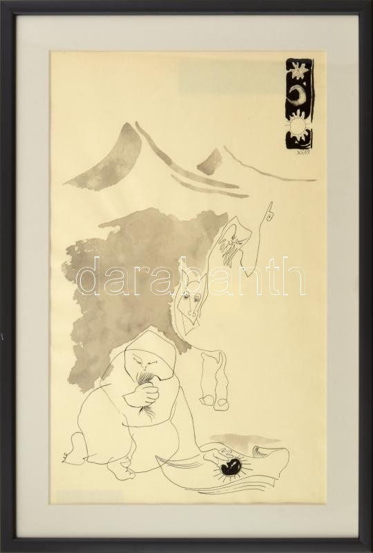 Lisziák Elek (1939-2007): Lao-ce, 1969. Tus, akvarell, papír, jelezve jobbra fent, hátoldalán autográf felirattal. Üvegezett fakeretben. 41,5×25 cm / Elek Lisziák (1939-2007): Laozi (Lao-Tze). Ink and watercolour on paper, signed, with autograph descripti