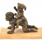 Lovacskázó kisfiúk, bronz szobor, sérült csont talapzaton, jelzés nélkül, 9x5x6,5 cm<a href="https://www.darabanth.com/hu/gyorsarveres/421/kategoriak~Mutargy-papirregiseg-egyeb/Szobrok-kisplasztikak-plakettek~500009/Lovacskazo-kisfiuk-bronz-szobor-s