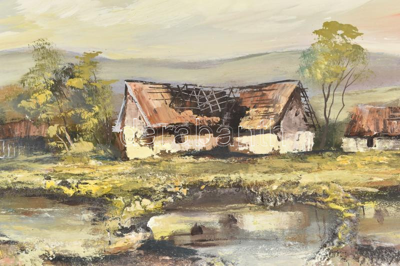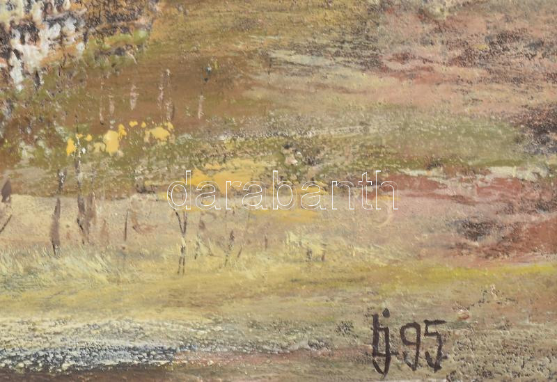 Lukács János (1952-): Táj. Olaj, farost, jelzett, hátoldalán Műkincs Kft. címkéjén feliratozott. Dekoratív fakeretben, 40×80 cm<a href="https://www.darabanth.com/hu/gyorsarveres/430/kategoriak~Festmenyek-es-grafikak/Festmenyek-es-grafikak~500003/Luk