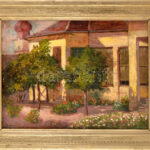 Lukácsy János (1884-1944): Ceglédi virágos udvar, háttérben a református templommal. Olaj, karton, jelezve balra lent. Kissé vetemedett. Dekoratív fakeretben. 49×65 cm