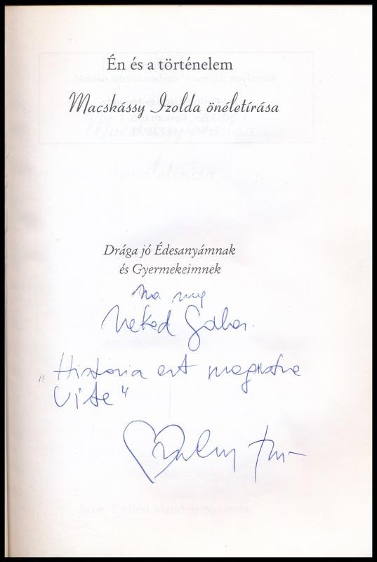 Macskássy Izolda: Én és a történelem. Macskássy Izolda önéletírása. Szerk.: Nagy Alexandra. Bp., é.n., Szent Gellért Kiadó. Fekete-fehér képekkel illusztrált. Kiadói papírkötés, kissé hullámos lapokkal. A szerző, Macskássy