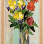 Magos Gyula (1932-1995): Csendélet. Olaj, farost, jelezve jobbra lent. Fakeretben. 57×28,5 cm<a href="https://www.darabanth.com/hu/gyorsarveres/440/kategoriak~Festmenyek-es-grafikak/Festmenyek-es-grafikak~500001/Magos-Gyula-1932-1995-Csendelet-Olaj-