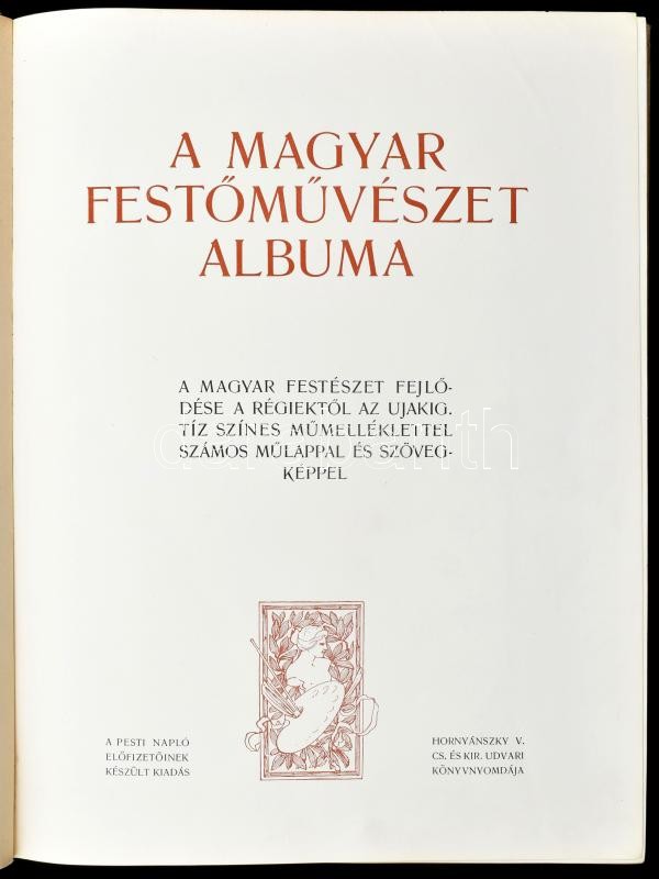 Magyar festőművészet albuma. A magyar festészet fejlődése a régiektől az újakig. Tíz színes műmelléklettel számos műlappal és szövegképpel. A Pesti Napló előfizetőinek készült kiadás. [Bp., 1904], Hornyánszky, 140 p.+10 (műmellékletek, a képek előtt felir