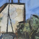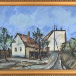 Makra János (1920-1991): Öreg házak. Olaj, farost, jelzett. Hátoldalon autográf felirattal és Képcsarnok Vállalat címkéjével. Dekoratív fa keretben. 55×70 cm.