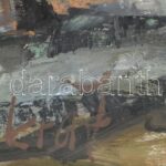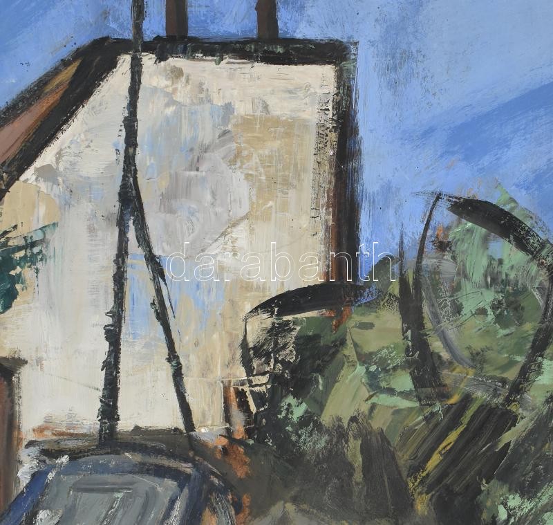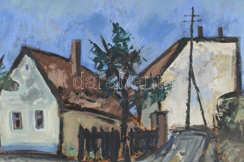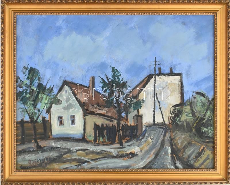 Makra János (1920-1991): Öreg házak. Olaj, farost, jelzett. Hátoldalon autográf felirattal és Képcsarnok Vállalat címkéjével. Dekoratív fa keretben. 55×70 cm.<a href="https://www.darabanth.com/hu/gyorsarveres/411/kategoriak~Festmenyek-es-grafikak/Fe
