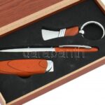 Manager készlet, fa dobozban, toll, öngyújtó, kulcstartó.