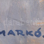 Markó Ernő (1868-1945): Óbudai kikötő hajókkal. Olaj, karton, jelzett. Hátoldalán Szegedi kiállítás 1938 raglapjával és egy további kiállítás címke töredékével. Dekoratív. sérült fakeretben, 44×58 cm<a href="https://www.darabanth.com/hu/gyorsarveres
