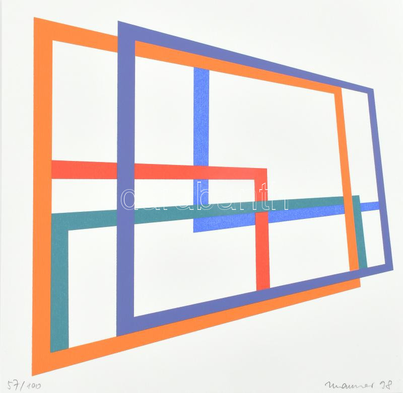 Maurer Dóra (1937): Geometriai kompozíció 1998. szitanyomat, papír, jelzett, számozott (52/100) 20cm x 20cm,<a href="https://www.darabanth.com/hu/gyorsarveres/432/kategoriak~Festmenyek-es-grafikak/Festmenyek-es-grafikak~500023/Maurer-Dora-1937-Geome