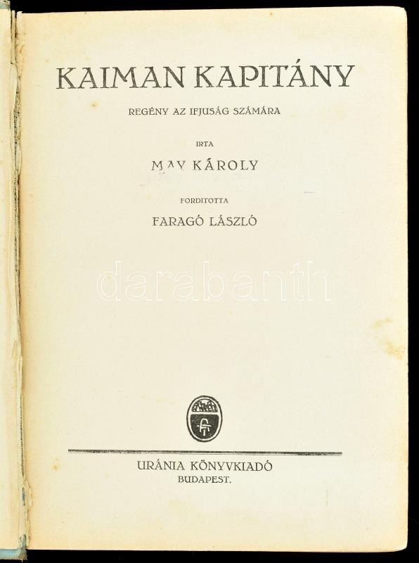 May Károly: Kaiman kapitány. Fordította: Faragó László. Bp., é.n., Uránia. Kiadói aranyozott, festett, illusztrált egészvászon-kötés, kopott borítóval, hiányzó elülső szennylappal.