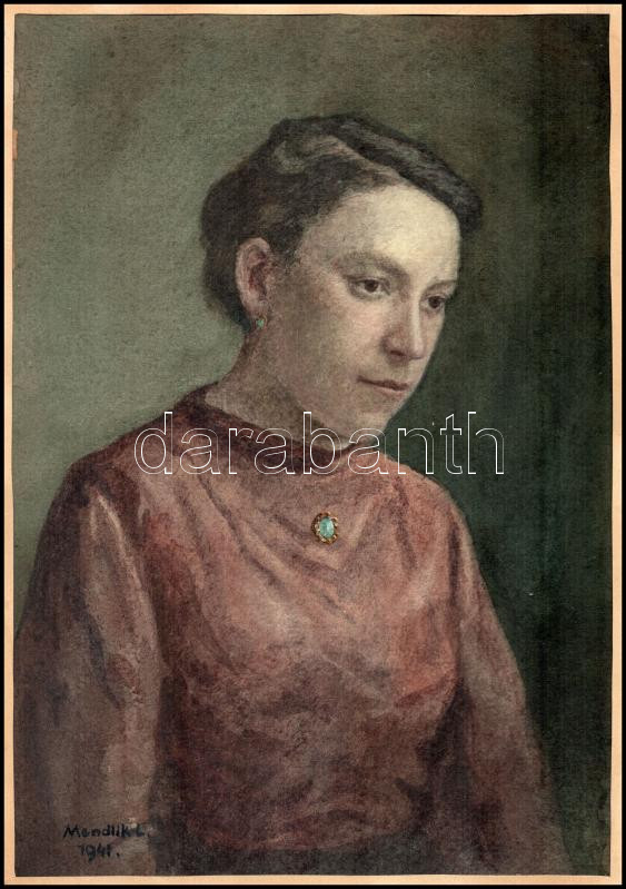 Mendlik Lajos (1903-1985): Hölgy türkiz brossal és fülbevalóval, 1941. Akvarell, papír, jelzett. 26×18 cm<a href="https://www.darabanth.com/hu/gyorsarveres/430/kategoriak~Festmenyek-es-grafikak/Festmenyek-es-grafikak~500003/Mendlik-Lajos-1903-1985-H
