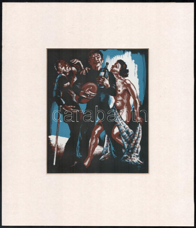 Menyhárt József (1901-1976): Mulatozók (art deco grafika). Linómetszet, papír. Jelzett a metszeten, paszpartuban. 16,5×13 cm<a href="https://www.darabanth.com/hu/gyorsarveres/434/kategoriak~Festmenyek-es-grafikak/Festmenyek-es-grafikak~500001/Menyha