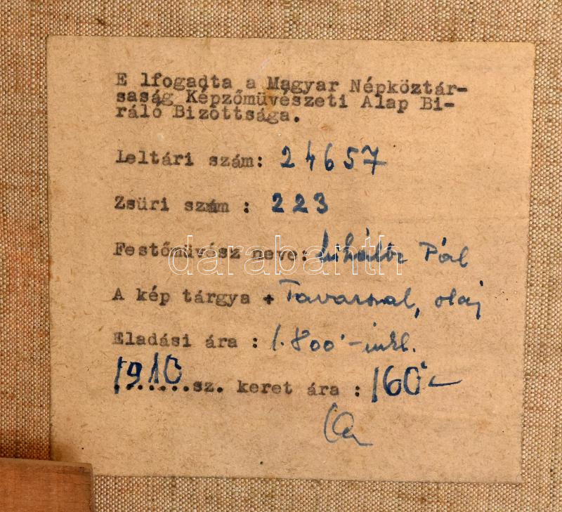 Miháltz Pál (1899-1988): Tavasszal (festő a szabadban), 1957. Olaj, vászon. Jelezve jobbra lent. Hátoldalán autográf felirattal és Képzőművészeti Alap bíráló bizottságának címkéjével. 70×60 cm / Oil on canvas. Signed lower right. With autograph descriptio
