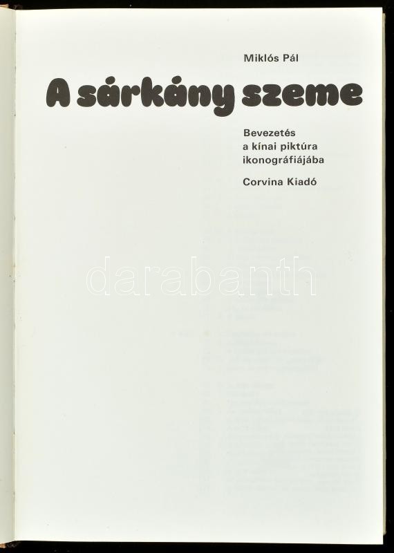 Miklós Pál: A sárkány szeme. bevezetés a kínai piktúra ikonográfiájába. Bp., 1973, Corvina. Gazdag fekete-fehér és színes képanyaggal illusztrált. Kiadói egészvászon-kötés, kiadói papír védőborítóban.<a href="https://www.darabanth.com/hu/gyorsarvere