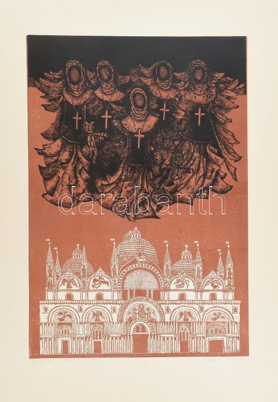 Molnár Gabriella (1940-): Apácák a San Marcon. Linómetszet, papír. Jelzett. Számozott: 37/50. Lapszéli apró szakadásokkal. 50×35 cm<a href="https://www.darabanth.com/hu/gyorsarveres/427/kategoriak~Festmenyek-es-grafikak/Festmenyek-es-grafikak~500001