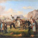 Molnár József (1821-1899): Párbaj (csatajelenet). Olaj, vászon, jelezve balra lent. Restaurált. Proveniencia: BÁV, 74. művészeti aukció, 1987, 176. tétel. Reprodukálva: BÁV, 74. művészeti aukció, 1987, katalógus (oldalszám nélkül). Hátoldalán BÁV 74. aukc