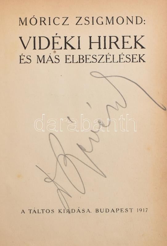 Móricz Zsigmond: Vidéki hírek és más elbeszélések. Bp., 1917, Táltos. Haranghy Jenő illusztrációival. Átkötött kopott félvászon-kötés, kissé laza fűzéssel, névbejegyzéssel.<a href="https://www.darabanth.com/hu/gyorsarveres/417/kategoriak~Konyvek/Kon