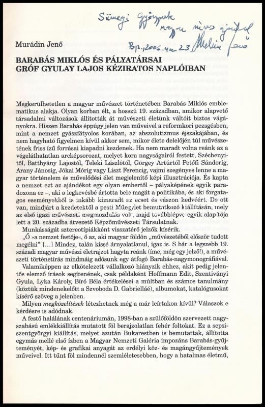 Murádin Jenő: Barabás Miklós és pályatársai gróf Gyulay Lajos kéziratos naplóiban. A szerző, Murádin Jenő (1937-) által Sümegi György (1947-) művészettörténésznek dedikált! H.n., 2005, k.n.. 297-304p. Különlenyomat az Ars