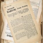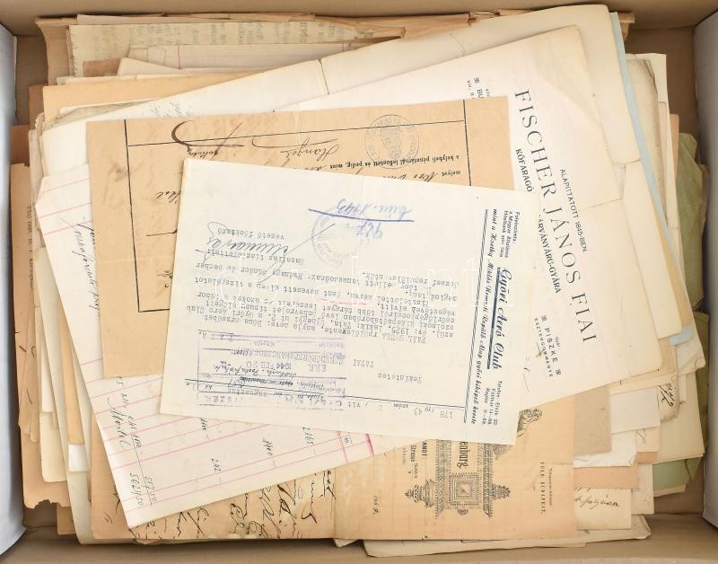 Nagy doboznyi papírrégiség tétel. Számlák, nyomtatványok, hirdetmények, újságok az 1800-as évek elejétől. Érdekes anyag, érdemes átnézni