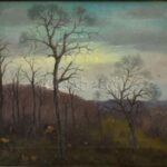 Nagy Pál (?-?, nagybányai festőnövendék 1917-ben): Erdélyi táj rőzsehordóval, 1923. Olaj, vászon. Jelezve jobbra lent. Dekoratív, sérült fa keretben. 24×26,5 cm.