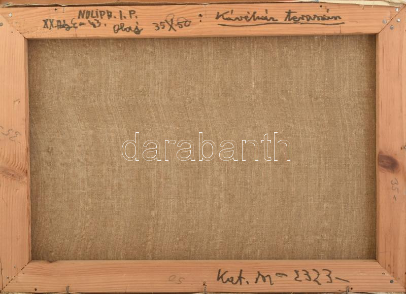Nolipa István Pál (1907-1986): Kávéház teraszán, 1976. Olaj, vászon. Jelezve jobbra lent, hátoldalán autográf felirattal. 35×50 cm / oil on canvas, signed, with autograph description on the reverse<a href="https://www.darabanth.com/hu/nagyaukcio/40/