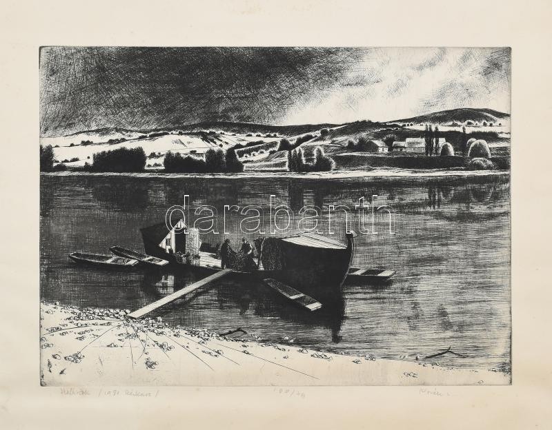 Novák Lajos (1927-1989): Halászok, 1981. Rézkarc, papír, jelzett, számozott (100/79), hullámos, lap széle kissé foltos, 29×39 cm<a href="https://www.darabanth.com/hu/gyorsarveres/422/kategoriak~Festmenyek-es-grafikak/Festmenyek-es-grafikak~500001/No