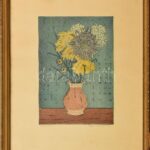 Nyári Lóránt (1928-1982): Csendélet. Linómetszet, papír, jelzett, lap széle foltos, üvegezett fakeretben, 28,5×19,5 cm<a href="https://www.darabanth.com/hu/gyorsarveres/417/kategoriak~Festmenyek-es-grafikak/Festmenyek-es-grafikak~1/Nyari-Lorant-1928