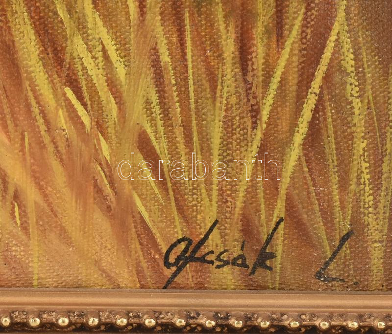 Ofcsák László (?-): Fácánok. Olaj, vászon. Dekoratív fakeretben. 40×50 cm<a href="https://www.darabanth.com/hu/gyorsarveres/438/kategoriak~Festmenyek-es-grafikak/Festmenyek-es-grafikak~500001/Ofcsak-Laszlo-Facanok-Olaj-vaszon-Dekorativ-fakeretben-40
