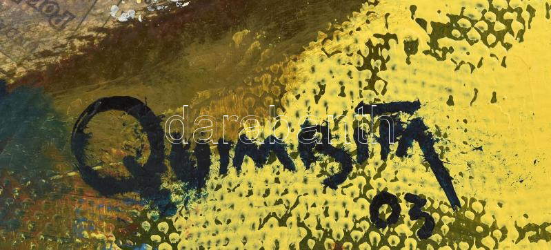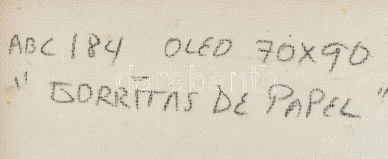 Olmedo Quimbita (1965-), ecuadori festő: Borritas de Papel. Olaj, kollázs, vászon, jelzett, a hátoldalán autográf felirattal, fakeretben, 90×70 cm / Olmedo Quimbita (1965-), Ecuadorian painter: Borritas de Papel. Oil and collage on canvas, signed, with au
