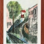 Olvashatatlan jelzéssel: Utcarészlet. Ceruza, kréta, akvarell, papír, üvegezett fa keretben, 35×24 cm
