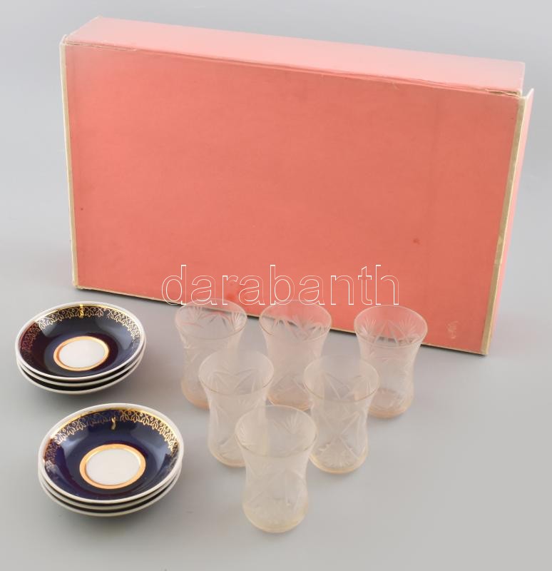 Orosz csiszolt üveg és porcelán teás készlet 6 személyes dobozában, kopásnyomokkal.<a href="https://www.darabanth.com/hu/gyorsarveres/417/kategoriak~Porcelan-keramia-uveg/Uvegtargyak~7/Orosz-csiszolt-uveg-es-porcelan-teas-keszlet-6-szemelyes-dobozab