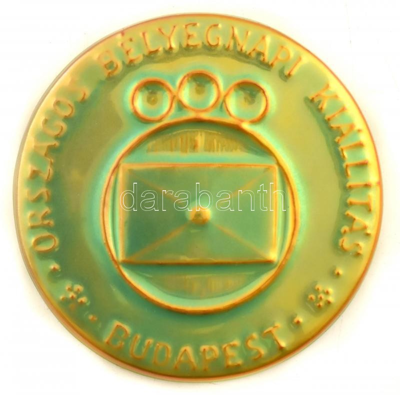 ‘Országos bélyegnapi kiállítás – Budapest’ Zsolnay eozinmázas emlékérem, jelzett, apró kopásnyomokkal, d: 10 cm<a href="https://www.darabanth.com/hu/gyorsarveres/417/kategoriak~Porcelan-keramia-uveg/Porcelan~6/Orszagos-belyegnapi-kiallitas-Budapest-