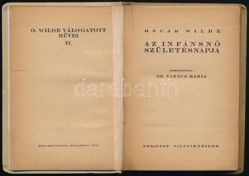 Oscar Wilde: Az infánsnő születésnapja. Ford.: Takács Mária. Oscar Wilde Válogatott Művei II. köt. Bp., én., Világirodalom. Kiadói egészvászon-kötés, kopott borítóval, a címlapon hiánnyal.<a href="https://www.darabanth.com/hu/gyorsarveres/417/katego