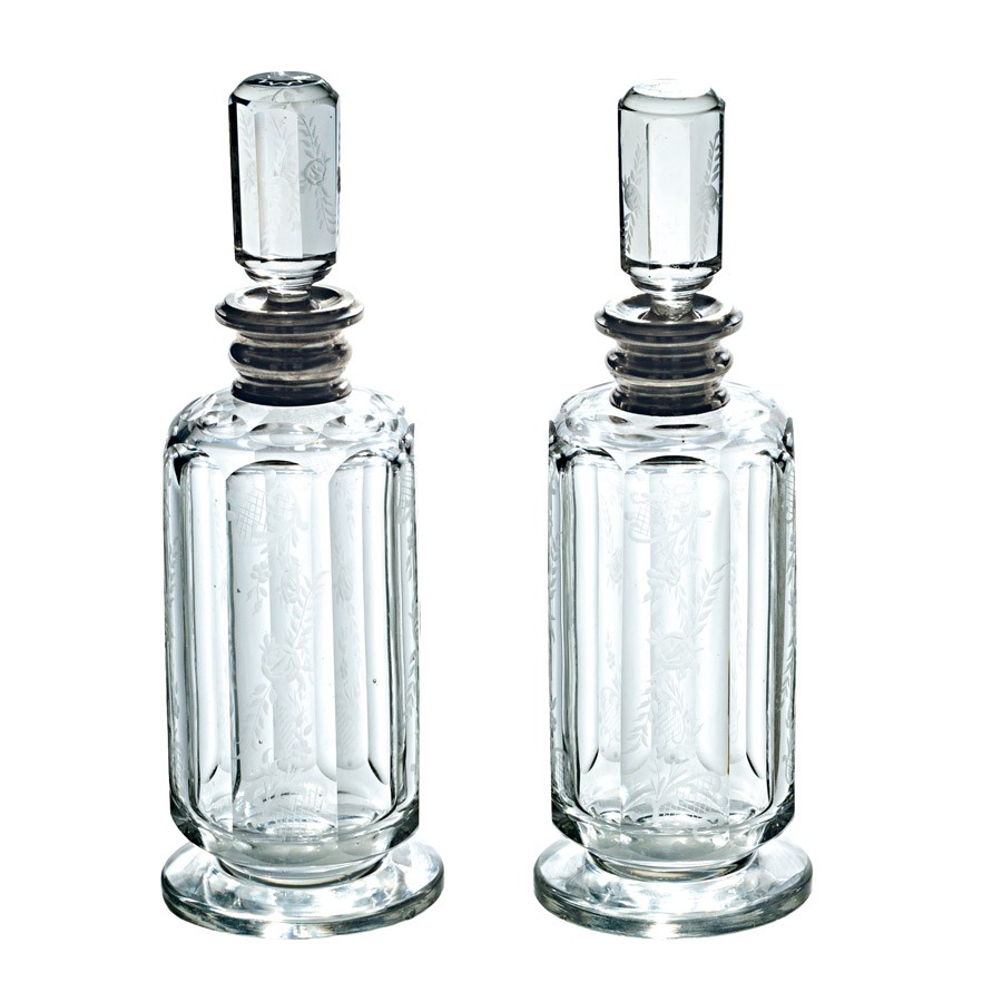 olasz, 1900 körül, csiszolt, színtelen üveg, köszörült díszítéssel, nyakán 800 ezrelékes ezüst gyűrűvel, egyik dugó javított, m: 25, 5 cm