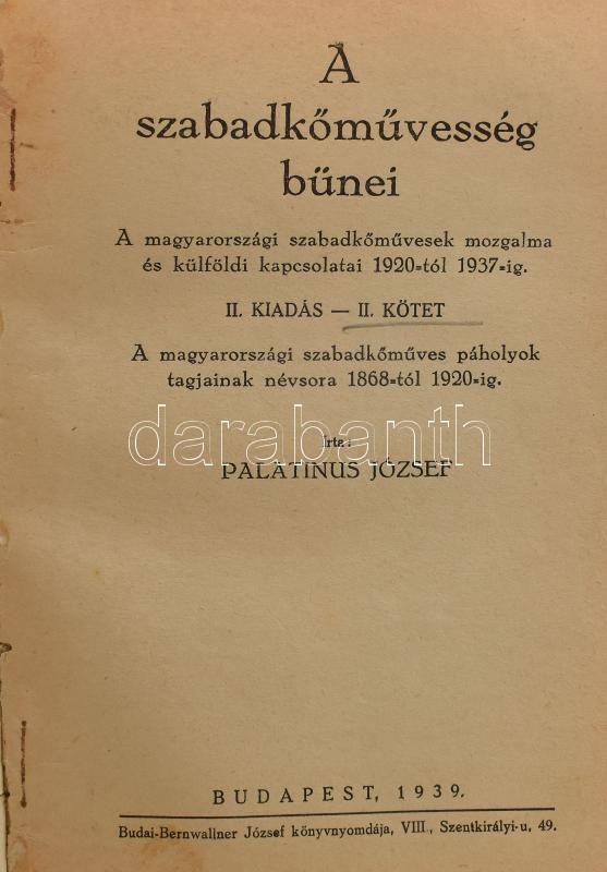 Palatinus József: A szabadkőművesség bűnei. A magyarországi szabadkőművesek mozgalma és külföldi kapcsolatai 1920-tól 1937-ig. III. kiadás – I. köt. Bp., 1938, Lőcsey. + II. kiadás-II. köt. A magyarországi szabadkőműves páholyok tagjainak névsora 1868-tól