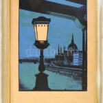 Pataky Béla (1932-2023): Alkonyat (Budapest, Lánchíd, háttérben a Parlament). Linómetszet, papír. Jelzett. Pataky Béla autográf ajándékozási soraival 1968-ból. Üvegezett fakeretben, 40×29,5 cm<a href="https://www.darabanth.com/hu/gyorsarveres/436/ka